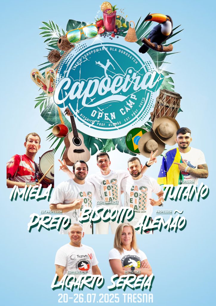 Capoeira Open Camp to wyjątkowe letnie zgrupowanie stworzone z myślą o pełnoletnich uczestnikach, którzy chcą połączyć pasję do Capoeira z wakacyjnym wypoczynkiem. Podczas tygodniowego obozu czekają na Ciebie intensywne i inspirujące warsztaty Capoeira, Maculelê, lekcje gry na instrumentach, treningi akrobatyczne i wiele więcej. Jednym z kluczowych elementów obozu jest również festa brazylijska.