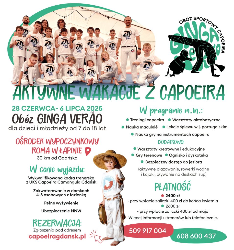 „Ginga Verão” czyli balansujące lato to 8-dniowy wyjazd, na którym uczestnicy będą mogli poprawić swoje umiejętność w Capoeira, spędzić aktywnie czas,